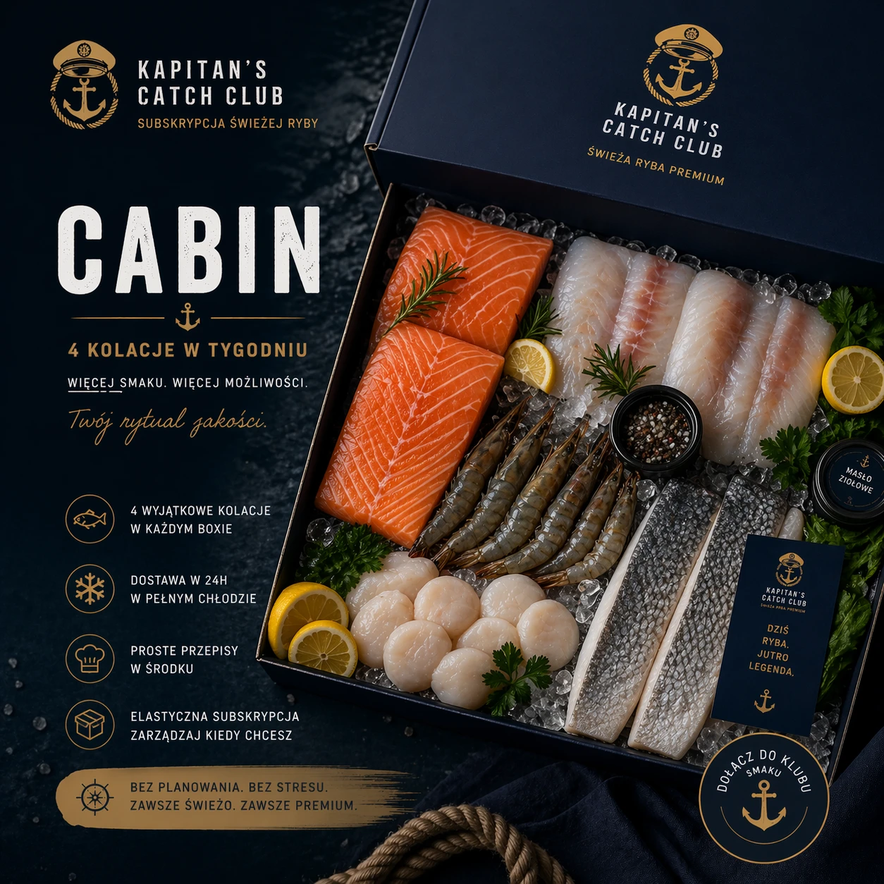 Kapitan’s Catch Club to subskrypcja, która zapewnia regularne dostawy świeżych ryb i owoców morza najwyższej jakości. W pakiecie CABIN otrzymujesz 4 dostawy miesięcznie, każdą starannie zaplanowaną przez Kapitana.