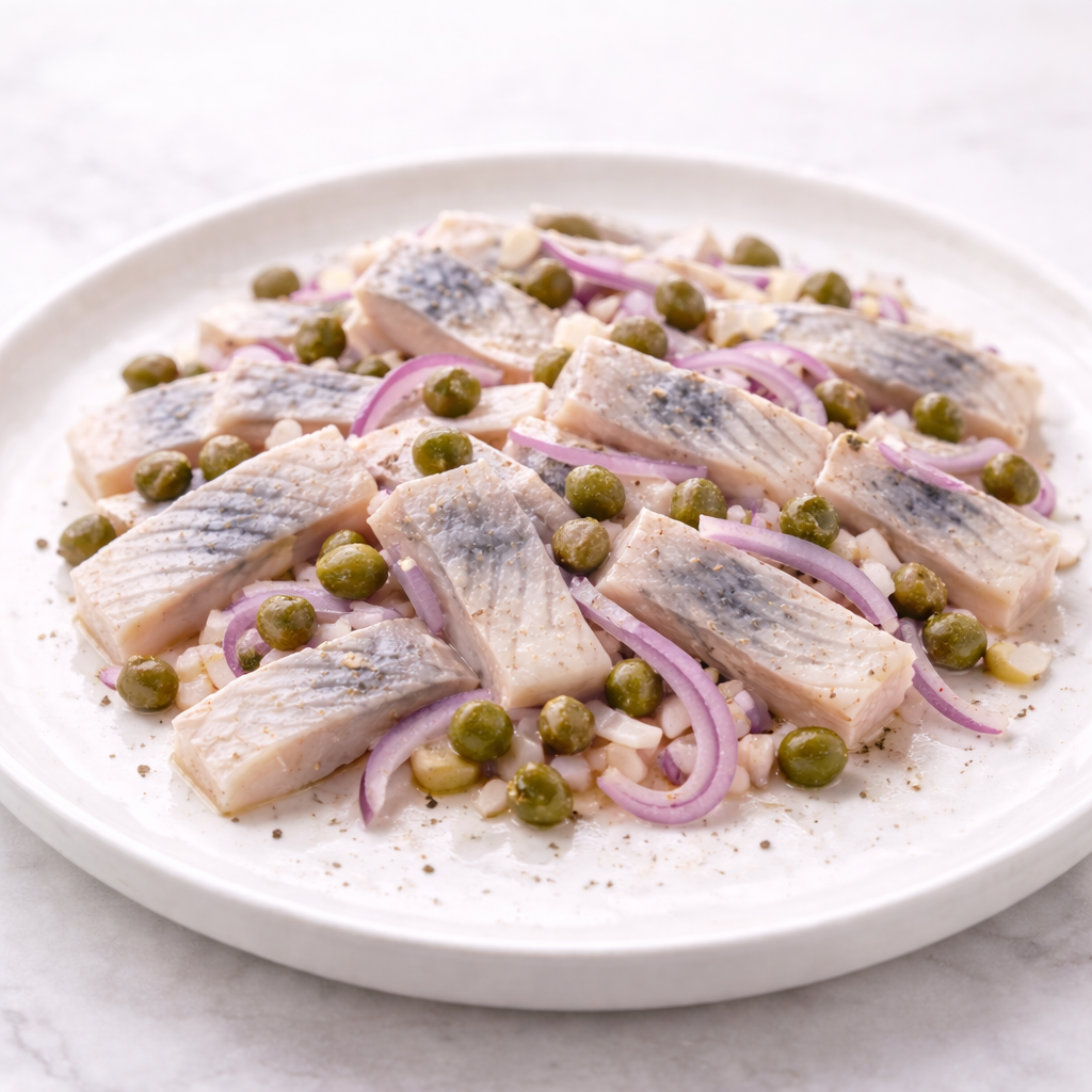 Filet z matjasa holenderskiego, cebula, kapary, olej słonecznikowy